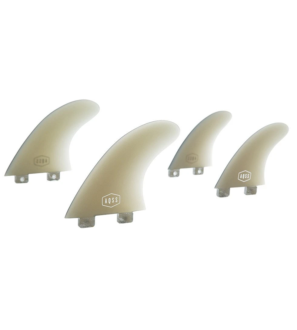 The AQSS Jet Set medium 5-Fin set are one fast set of fins. These fibreglass fins will perform in a variety of surf conditions and will allow for either a Thruster or Quad setup depending on the conditions. With a flatter foil template, these fins offer a balanced combination of drive, pivot and hold, and boast a consistent and reliable feel over a variety of wave conditions.