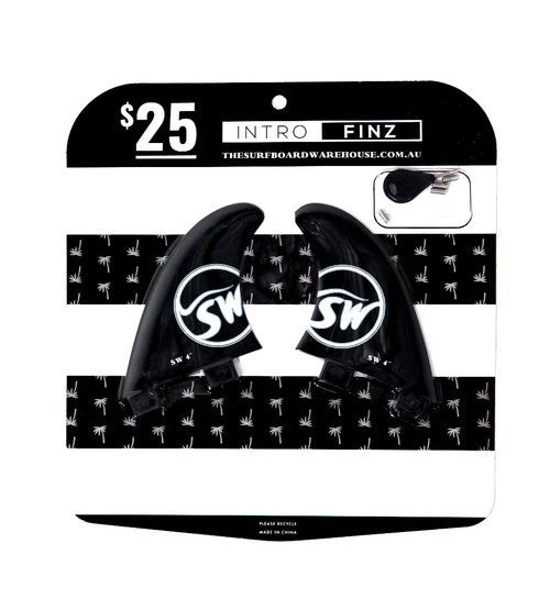 Includes 2x 4″ plastic surfing fins compatible with twin tab systems for a quad setup or 2+1 as stabilising fins.