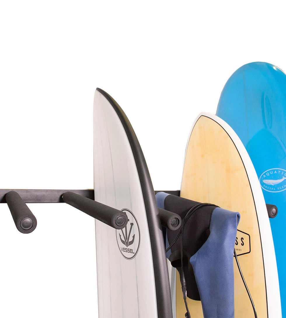 This Board Rack range features strong, heavy duty metal frames with soft EVA foam padding to protect your boards whilst in storage. Each rack offers a variety of functionality and versatility to accommodate your storage needs so whether you require a ceiling mount, wall mount or free standing rack, The Surfboard Warehouse Board Rack range has something for you.